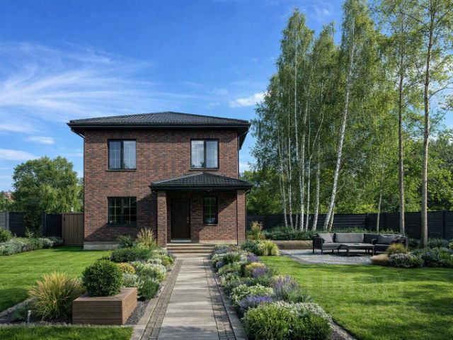 На участке хвойные и садовые деревья, кустарники, газон, дорожки, стоянка, участок огорожен.