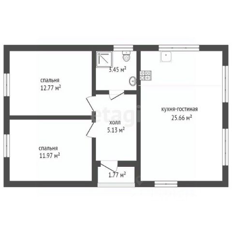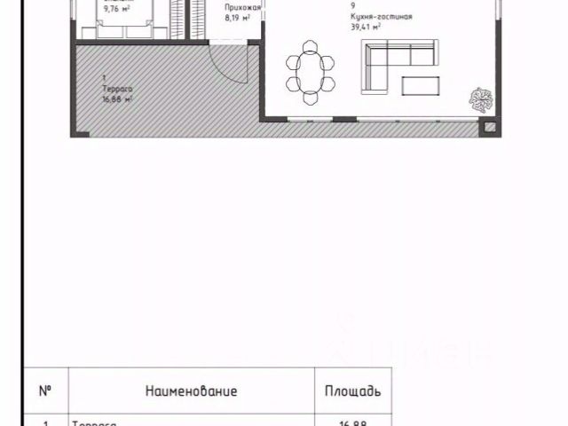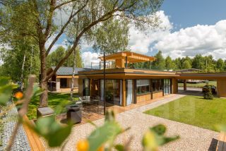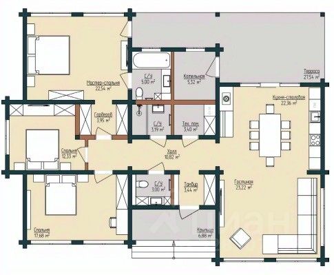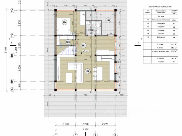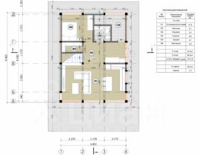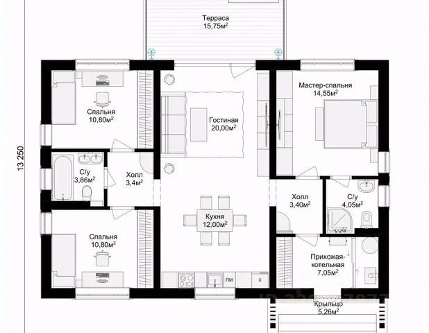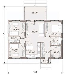 Дом одноэтажный. Состоит из: трёх спален 9.6 кв.м., 11 кв.м., 21 кв.м.; кухня-гостиная 20 кв.м.; две террасы 19.5 кв.м. и 6 кв.м.; два санузла; гардеробная комната.