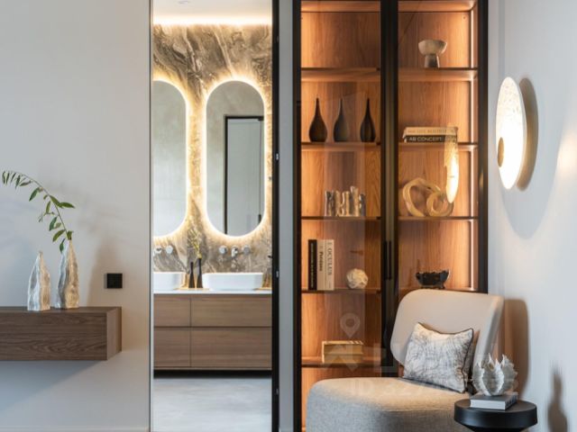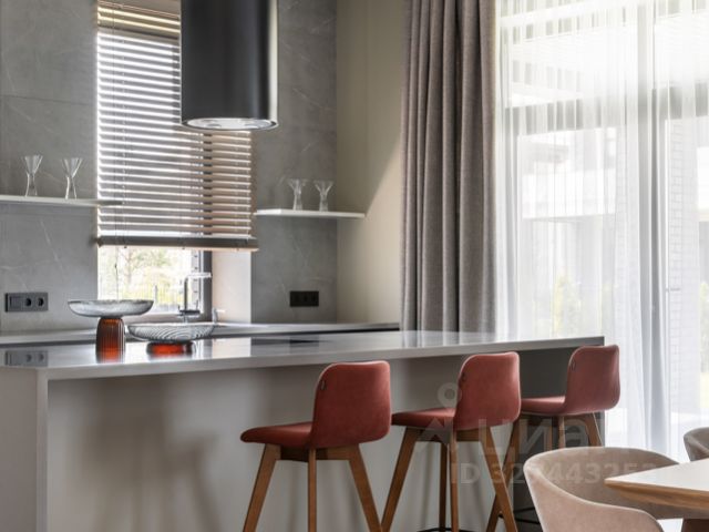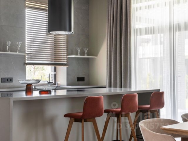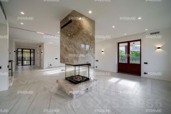 В доме: 3 спальни, холл с парадной винтовой лестницей и панорамными окнами высотой 9,1 м (тройной свет), кухня-столовая с выходом на террасу, гостиная с круговым дровяным камином в центре зала, кинотеатр с бильярдной, спа зона с сауной и хаммамом, спортивный зал на третьем этаже с панорамным видом на участок, постирочная, гараж на 2 машиноместа.