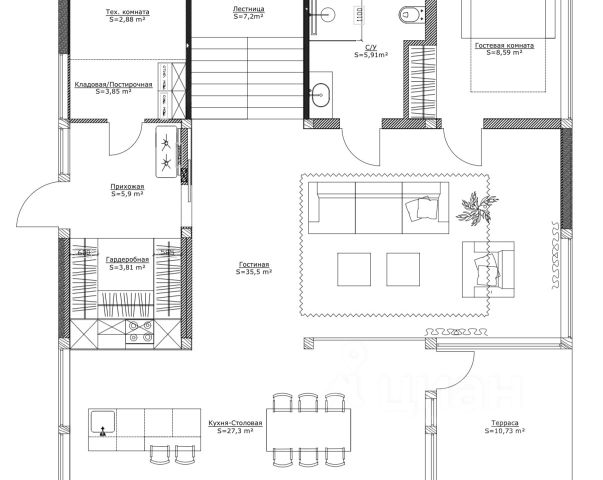 Общие помещения: вестибюль (98,2), гостиная (75,4), кухня-столовая (34,4), веранда (22), кабинет (21,7), гардеробная (18,5), гостевой с/у (4,3), гараж на 2 м/м (53,3).