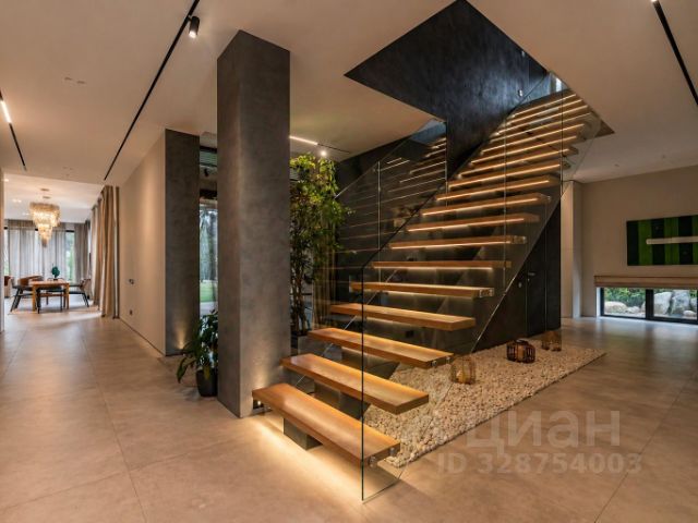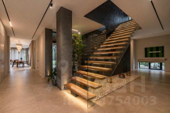 В доме: 3 спальни, холл с парадной винтовой лестницей и панорамными окнами высотой 9,1 м (тройной свет), кухня-столовая с выходом на террасу, гостиная с круговым дровяным камином в центре зала, кинотеатр с бильярдной, спа зона с сауной и хаммамом, спортивный зал на третьем этаже с панорамным видом на участок, постирочная, гараж на 2 машиноместа.