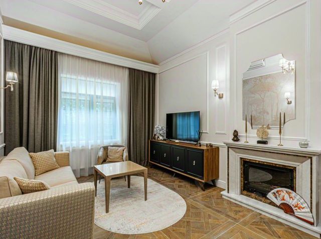 В отделке использовано натуральное дерево, установлены итальянские межкомнатные двери, сантехника Villeroy & Boch, паркет и керамогранит в теплых оттенках. Стены окрашены качественной моющейся краской.