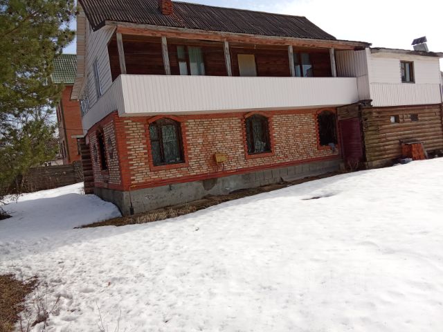 БОЛЬШОЙ ДОМ (1998-2000 года постройки) из бруса, обшит сайдингом. На 1-м этаже расположена кухня, санузел с ванной (установлен электрический бойлер), спальня и гостиная с камином, в прихожей печь для отапливания дровами. 2-й этаж: 3 комнаты, санузел с душевой кабиной, балкон.