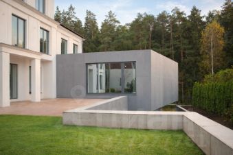 Современный дом без отделки 1050 кв.м. с плоской кровлей и большим панорамным остеклением, расположен в поселке Никольская слобода, самом близком из всех элитных поселков Новорижского шоссе.