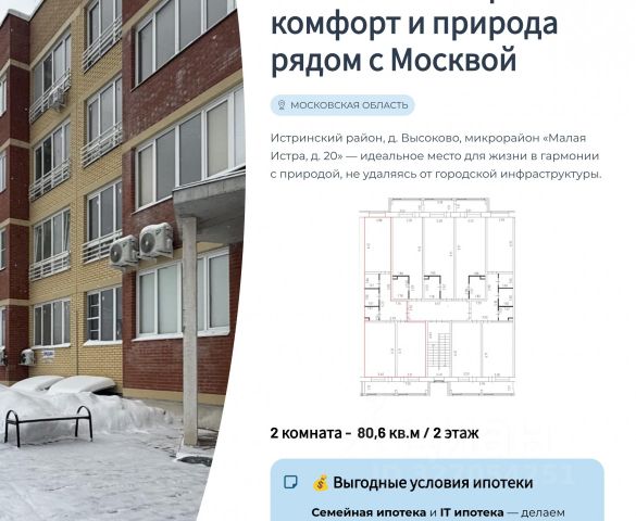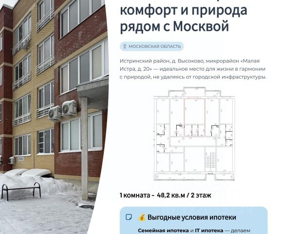 (Исх. 514271 - РИ) СЕМЕЙНАЯ ИПОТЕКА возможна. Продается квартира студия с большой лоджией 29.3 м² в ЖК "Малая Истра". Продается квартира студия с большой лоджией 29.3 м² на 3 этаже в современном 4-этажном монолитно-кирпичном доме "Малая Истра". Идеальное решение для большой семьи, ценящей функциональность и комфорт. Ключевые преимущества квартиры: Планировка: Комната 16.4 кв.м, большая лоджия 6.8 кв.м.. Комплектация: Санузел 4.4 кв. м., коридор 3.6 кв .м. Инфраструктура и локация: Во дворе: детские и спортивные площадки, магазины шаговой доступности, парковка. В 5-минутной доступности: гипермаркеты "Леруа Мерлен" и "Лента". Отличная транспортная доступность: 3 мин на машине до г. Истра, 10 мин до ж/д станции "Истра". Быстрый выезд на Волоколамское и Новорижское шоссе. 32 км до Москвы. Финансы и сделка: Рассматриваем ипотеку. Все документы в порядке, квартира свободна от обременений. Возможна быстрая и безопасная сделка. Звоните, с радостью отвечу на все вопросы.