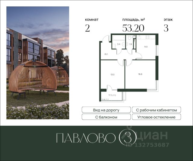 Старт продаж! Продается 2-комнатная квартира в новом клубном жилом комплексе "Павлово 3" площадью - 46.00 кв. м на 3 этаже, в корпусе 1 в малоэтажном монолитном доме от компании-застройщика. Из окон, а также с балкона, открывается вид на лес. В квартире предусмотрен отдельный рабочий кабинет. В квартире высокие потолки 3.25 м, что дает ощущение простора. Преимуществом также является большой санузел. "Павлово 3" - премиальный уровень комфорта загородной жизни в бизнес-классе. Выбирайте камерный квартал, он станет лучшим домом для каждого, кто ценит приватность и комфорт. Срок сдачи - 2 квартал 2027. Более подробная информация по телефону. Особенности комплекса: • Высота потолков в каждой квартире - от 3 метров; • Собственный детский сад; • Авторская концепция озеленения; • МЦД-2 "Нахабино" в 5 минутах езды; • Садовое кольцо в 35 минутах езды • Локация с насыщенной инфраструктурой столичного уровня: торговые центры, кафе, рестораны, учебные заведения, развлекательные и спортивные объекты. Расположение Клубный жилой комплекс бизнес-класса "Павлово 3" возводится в экологически чистом районе престижного северо-западного направления Москвы. Здесь природа и атмосфера спокойствия соседствуют с комфортом современного мегаполиса. 7 трехэтажных корпусов, выполненных в едином современном стиле, формируют уютную камерную атмосферу. Архитектура На первых этажах домов - просторные и функциональные входные группы, где предусмотрено все: мягкий интерьер в природных тонах, дизайнерская отделка натуральным деревом и камнем, панорамные окна с видом на лес, помещения для хранения колясок и спортивного инвентаря, а также специальные подъемники для маломобильных жителей. Благоустройство "Павлово 3" - это 6 га приватной охраняемой территории, 2 км прогулочных дорожек вдоль леса, 19 зон для тихого и активного отдыха и 3963 деревьев и цветущих кустарников, высаженных непосредственно на территории комплекса. Чтобы оказаться наедине с природой теперь достаточно пары минут пешком. Для жителей "Павлово 3" создан собственный выход в лес, благоустроены лаунж-зоны на свежем воздухе и гармонично вписаны в ландшафт ливневые сады. Здесь же появится барбекю-зона для уютных вечеров в кругу семьи и друзей. Инфраструктура Жителям доступна инфраструктура престижного района с известными ресторанами, спортивными клубами и рейтинговыми учебными заведениями. На территории клубного дома детям не придется скучать. В их распоряжении - 16 игровых площадок с инвентарем из природных безопасных материалов. А для поддержания здорового образа жизни предусмотрено 5 спортивных зон, включая воркаут-тренажеры, корты для мини-футбола, волейбола, падел-тенниса и баскетбола. Для гостей предусмотрен свой паркинг, а для владельцев электромобилей - зарядные станции. Количество машиномест равно количеству квартир. Вся территория оснащена системами безопасности и камерами видеонаблюдения, работает WI-FI.