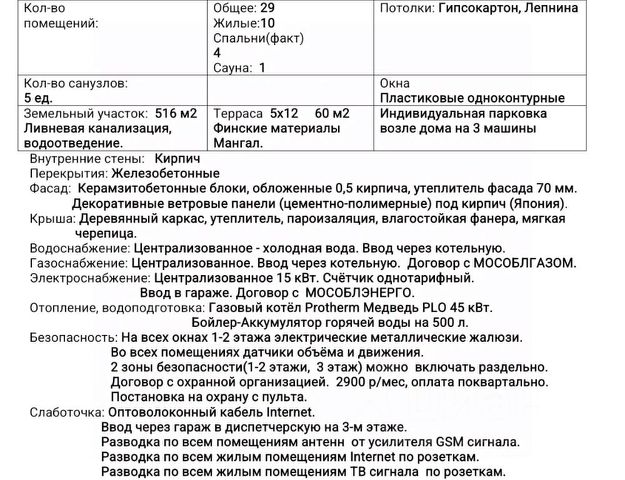 В доме: 5 спален с индивидуальными ванными комнатами и гардеробными, просторная кухня-гостиная с выходом на открытую веранду, кабинет/гостевая спальня с ванной комнатой, парадный холл с двумя гардеробными, 2 кладовые, котельная, теплый гараж на 2 м/м.
