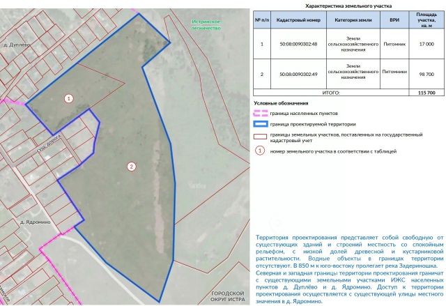 Продается участок под коттеджный поселок в хорошей локации! Новорижское шоссе!!! • Местоположение: Московская область, городской округ Истра, вблизи деревни Ядромино. • Кадастровый номер: 50:08:0090302:48, 50:08:0090302:49 • Площадь: 11,57 га (115 700 кв. м). • Стоимость: 5 000 000 рублей за 1 га. • Категория земли: СХ-3 Преимущества участка • Удобное расположение: 63 км от МКАД, выезд на Волоколамское шоссе, хорошая транспортная инфраструктура. Ж/д станция Ядрошино в пешей доступности. Автобусная остановка непосредственно на съезде к участку. • Чистая территория: свободная от строений, с ровным рельефом и минимальной растительностью. • Экология: рядом лесной массив, озеро, в 850 м — река Задериношка. • Социальная инфраструктура: Все необходимые объекты обслуживания (школы, детские сады, поликлиники) — в шаговой доступности в составе посёлков Ядромино, Рубцово, Курсаково. • Участок чистый, свободный от зон с особыми условиями использования территории и планировочных ограничений. Газ и электричество по границе участка. Есть проект по развитию территории данного земельного участка под коттеджный поселок, с концепцией и предварительными расчетами. Пакет документов на участок готов к сделке. Звоните с удовольствием отвечу на ваши вопросы!