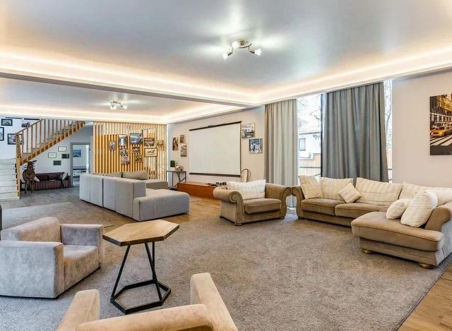На первом этаже большой банкетный зал (75 кв м), три больших раскладных дивана, телевизор, караоке, мощная колонка с блютузом, сауна, комната отдыха с большим раскладным диваном, душевая, бассейн с рециркуляцией и круглосуточным подогревом, два санузла. На втором этаже, - холл, четыре изолированные отдельные спальни, с дополнительными спальными местами, санузел с джакузи, подогрев пола.